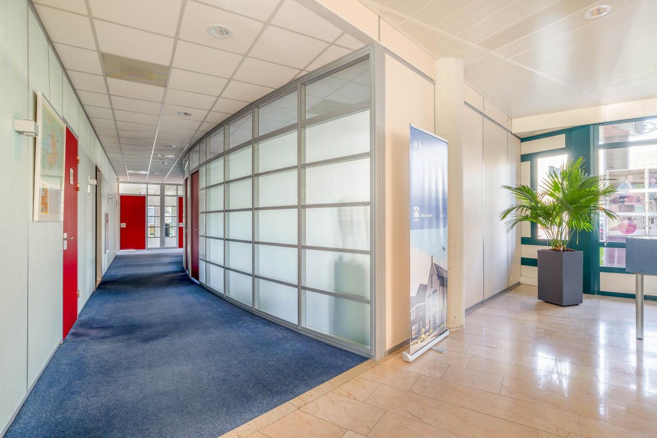 Indeling: hoofdentree; ruime hal/ontvangstruimte met natuurstenen vloer en veel lichtinval door de hoge ramen rondom, balie met groot bureau/desk voor prettige werkplek; lange hal welke toegang biedt tot zes (vergader)ruimtes; pantry met keukenblok voorzien van vaatwasser en koelkast; ruim archief/bergruimte; separaat dames _ en herentoilet met wastafel. Aan het einde van de hal is een tweede bergruimte en achter entree die toegang biedt tot de parkeerplaatsen achter het pand.