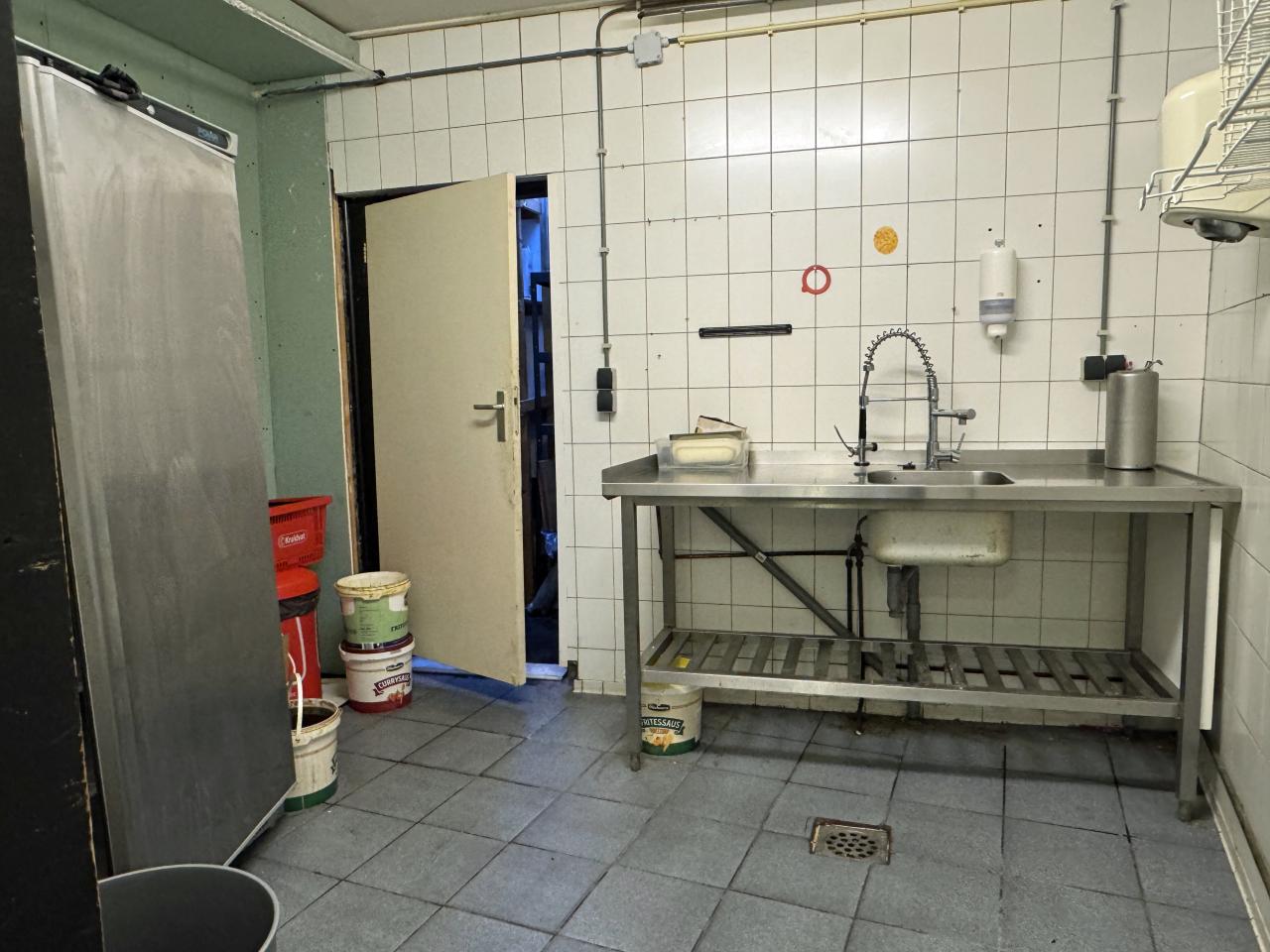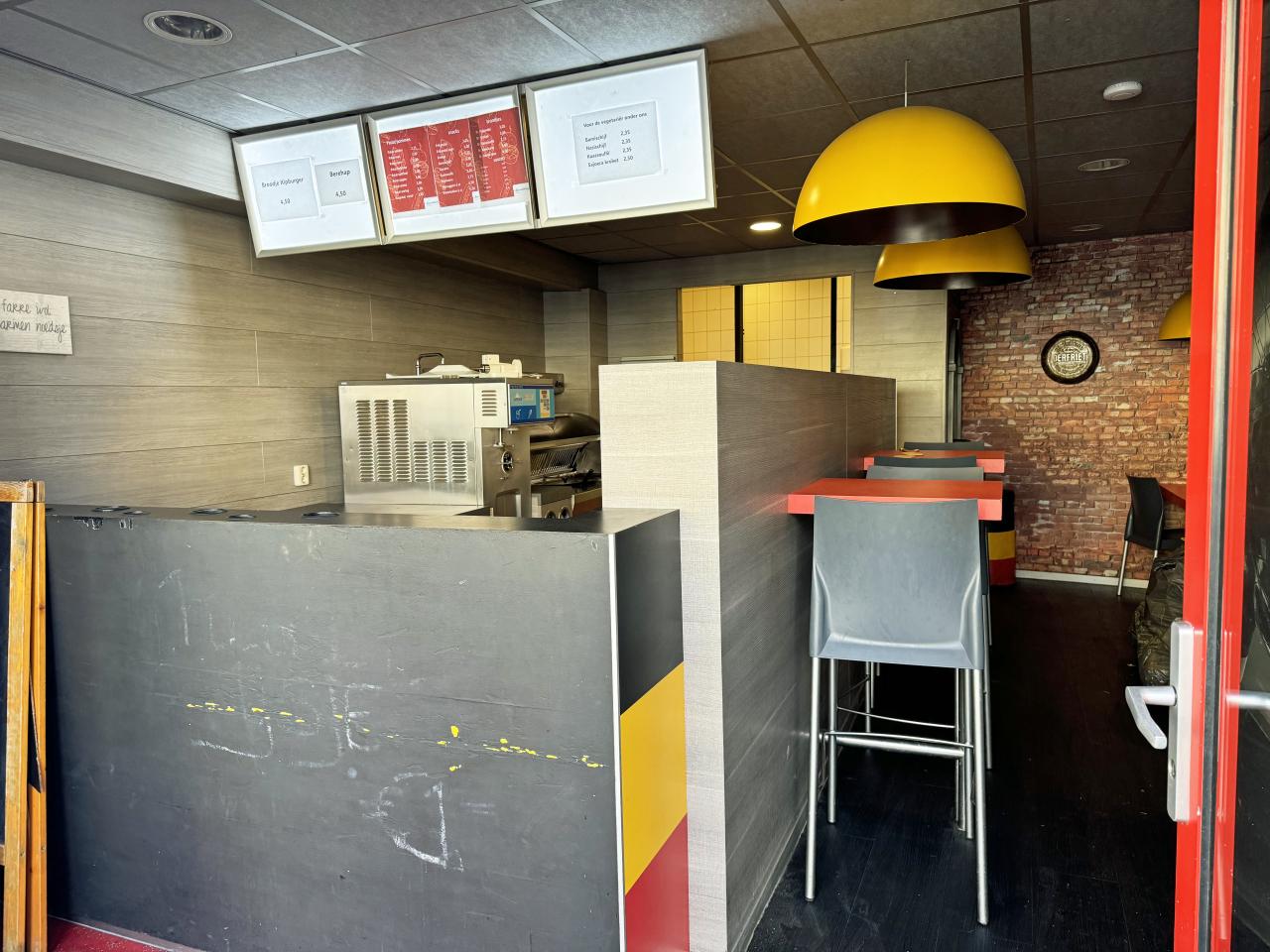 Restaurant/winkelruimte met een front van ca. 404 cm. Openslaande deuren, opslagruimte met koelcel, toilet.