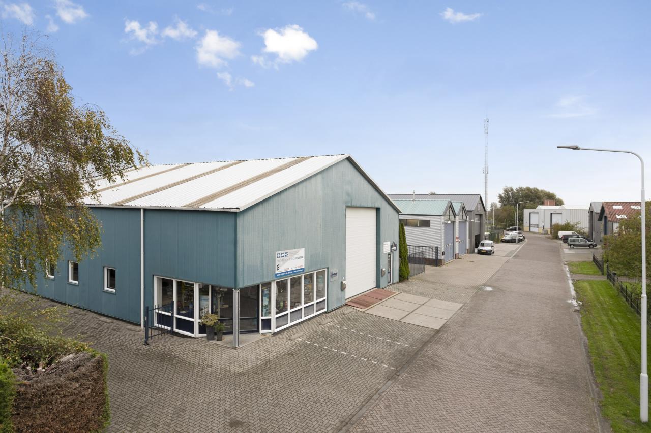 Het gebouw bestaat in hoofdlijnen uit showroom/kantoorruimte, een royale bedrijfshal aan de voorzijde met eigen entree en kantoorruimte, 2e kleinere bedrijfshal, werkplaats en een bovenwoning bestaande uit een grote woonkamer met open keuken, drie ruime slaapkamers, badkamer, balkon en grote zolderetage met stahoogte en veel opslagruimte. Op het terrein voor het pand zijn parkeerplaatsen voor bezoekers, het zij- en achterterrein biedt ruimte voor zakelijke activiteiten. Aan de achterzijde bevinden zich vier royale ligplaatsen in eigen water.
