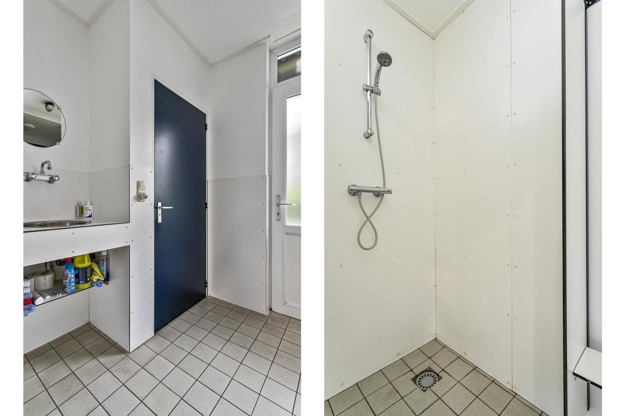 Links van deze hal bevindt zich de ingang showroom met kantoor van ca. 60 m2. Achter de showroom ligt een tweede hal (2) van ca. 65 m2 met hoge overheaddeur (4 x 4 m) en doorgang naar de huidige werkplaats (3). De werkplaats is ca. 155 m2 groot, heeft een eigen overheaddeur (ca. 3 x 3 m, met loopdeur), en een toiletgroep met douche ten dienste van de vier ligplaatsen en de werkplaats.