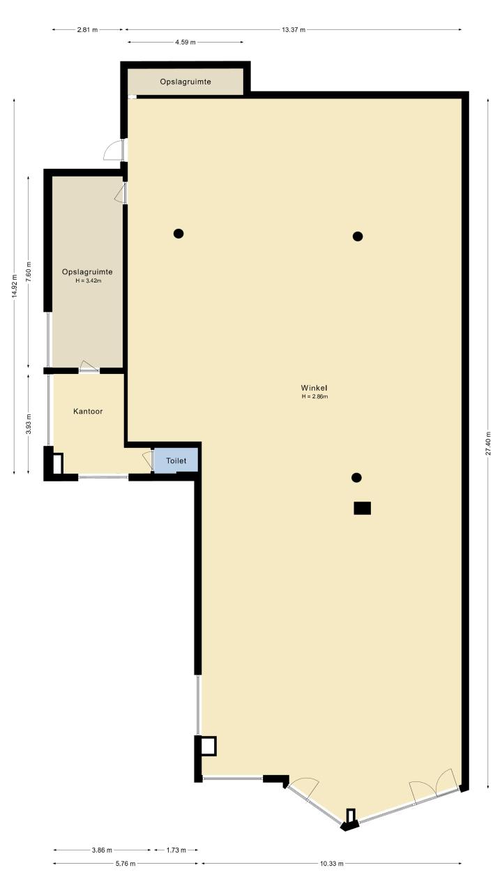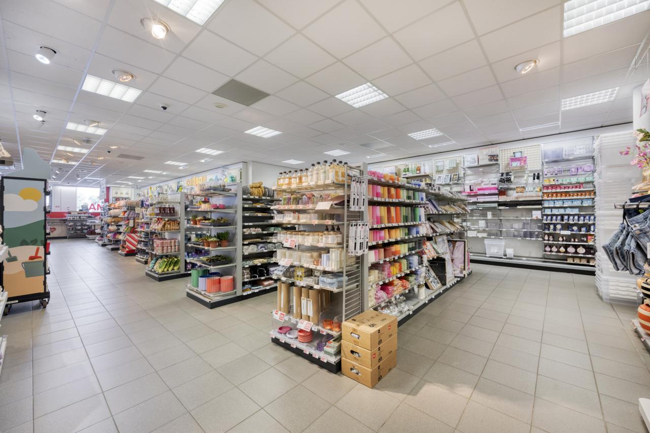 De ruimte heeft een totaal oppervlakte van ca. 425 m². De winkel beschikt over een toilet en systeemplafond met verlichtingsarmaturen.