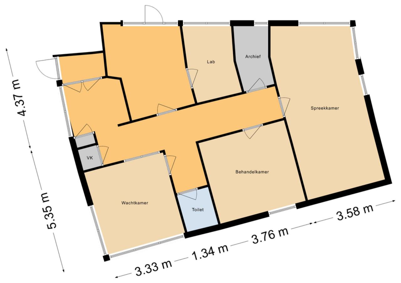 hal, wachtkamer, behandelruimte, administratieve ruimte, archief, spreekkamer, toilet, kitchenette.