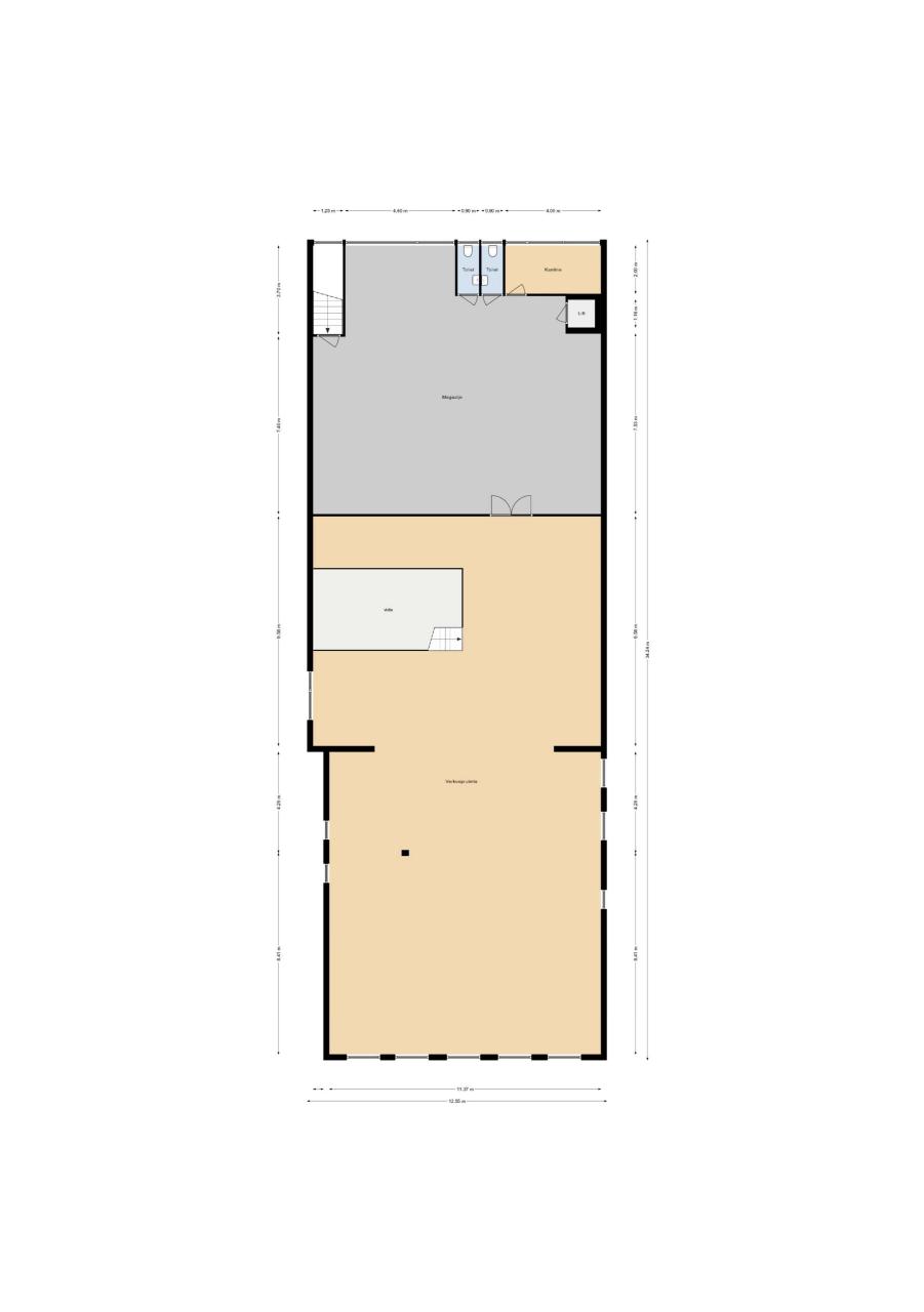 De winkelruimte heeft een verkoopvloer van ca. 563 m², verdeeld over 2 etages. Het pand beschikt over een tweetal magazijnruimten aan de achterzijde van de winkel. Het magazijn op de begane grond heeft een oppervlak van ca. 75 m² en het magazijn op de verdieping heeft een oppervlak van ca. 127 m². Deze laatste bestaat uit opslagruimte, toiletten en een kantine. Tevens is het magazijn voorzien van een lift.